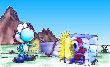 | Freeze Yoshi freezing a shyguy. Dig the cheap mountains! I was going through a big ol' obsession about how I needed to draw backgrounds more. That didn't get far, did it? :-P Freeze iz ©ZeroYoshi. | |